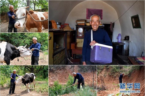 曹晋忠,男,1949年出生,山西省长治市武乡县铺上村人。曹晋忠是村里的动物防疫员,自己种了4亩玉米、2亩小米。因为妻子常年卧病在床,曹晋忠一家是该村的精准扶贫对象。曹晋忠说,医护人员经常上门进行健康状况随访,驻村工作队也常来家里帮忙,现在看病不发愁,干活有人帮,生活挺好的。 右上:曹晋忠肖像;左上、左中、左下:曹晋忠在给村里的牛做检查;下中、下右:曹晋忠在地里干农活(拼版照片,6月12日摄)。 地处晋东南的山西省长治市,位于由太行山、太岳山环绕而成的上党盆地中。在群山中、崖壁上,许多村庄自然条件恶劣,基础设施落后,脱贫致富是大山深处人们的迫切心愿。 近年来,一场场脱贫攻坚战,在一个个深山村打响。政府全力探索脱贫路径的同时,山区百姓因地制宜,靠自己的双手和智慧走上致富路,交出了一份扎实的脱贫答卷。 记者在太行山、太岳山一路寻访,记录下多位70岁老人的生活。这些共和国的同龄人,亲历了山乡的巨变,见证着长治山区脱贫攻坚伟大工程的一步步推进。 新华社记者 詹彦 摄