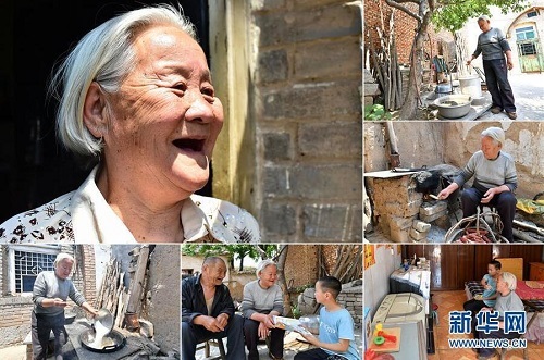 田何英,女,1949年出生,山西省长治市潞城区上黄村人,全家人靠种植5亩粮食地过日子,家人的重病使其陷入贫困。2015年开始,田何英和家人享受种植产业补贴和金融扶贫补贴,孙子上学享受“雨露计划”补贴。2017年,田何英家脱了贫。 左上:田何英肖像;右上:田何英在院子里;右中:田何英在生火做饭;右下:田何英和孙子一起看电视;下中:田何英(中)和家人在院子里;下左:田何英在做饭(拼版照片,6月11日摄)。 地处晋东南的山西省长治市,位于由太行山、太岳山环绕而成的上党盆地中。在群山中、崖壁上,许多村庄自然条件恶劣,基础设施落后,脱贫致富是大山深处人们的迫切心愿。 近年来,一场场脱贫攻坚战,在一个个深山村打响。政府全力探索脱贫路径的同时,山区百姓因地制宜,靠自己的双手和智慧走上致富路,交出了一份扎实的脱贫答卷。 记者在太行山、太岳山一路寻访,记录下多位70岁老人的生活。这些共和国的同龄人,亲历了山乡的巨变,见证着长治山区脱贫攻坚伟大工程的一步步推进。 新华社记者 曹阳 摄