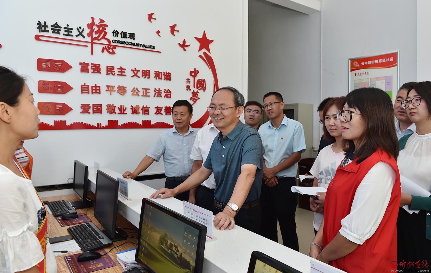 惠民社区创文气氛浓厚,墙上张贴着创文展板,随处可见温馨的提示,志愿者随时提供服务。郑连生检查了社区综合文化服务中心,向工作人员询问服务中心的功能和作用,并查看了社区创文资料。他强调,要切实发挥好综合文化服务中心在文化宣传、党员教育、科普教育、普法教育、市民教育、家长学校、道德讲堂等方面的作用,形成制度,制定活动计划,按期开展活动,促进群众素能的不断提升。