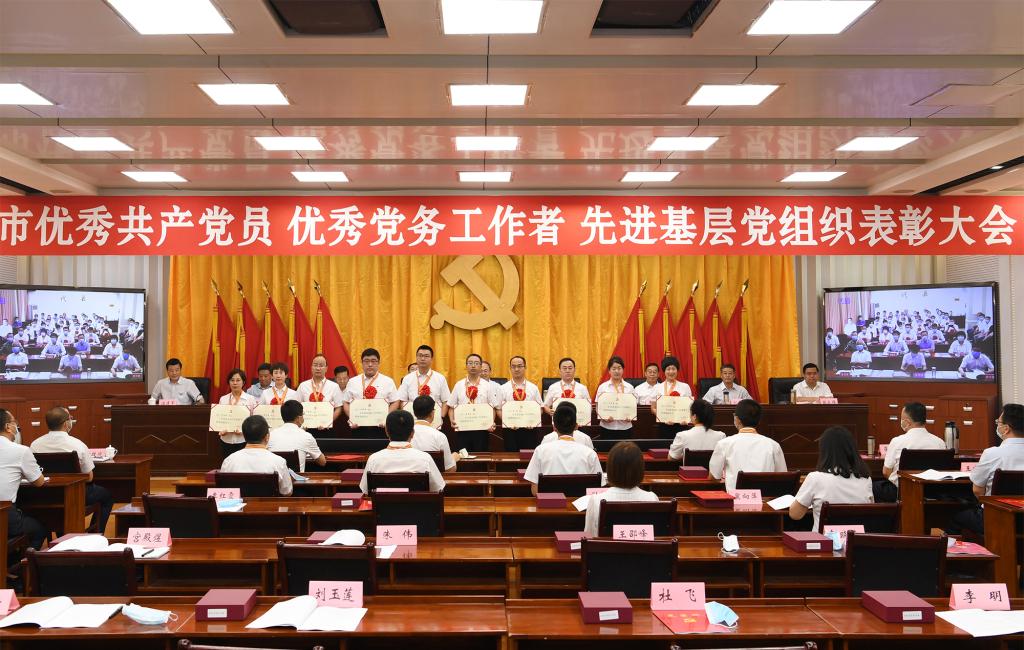 上午8时30分,大会正式开始,全体起立,奏唱国歌。来自全市各行各业、在工作中取得优异成绩的99名共产党员、100名党务工作者和100个基层党组织,分别被授予“全市优秀共产党员”“全市优秀党务工作者”“全市先进基层党组织”荣誉称号。受到表彰的优秀个人和先进集体代表先后上台领奖,会场响起热烈掌声。