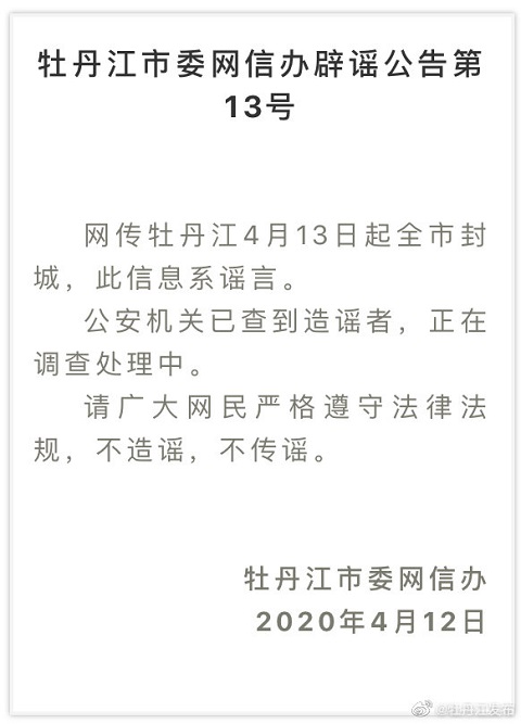 网传牡丹江4月13日起全市封城,此信息系谣言。公安机关已查到造谣者,正在调查处理中。请广大网民严格遵守法律法规,不造谣,不传谣。