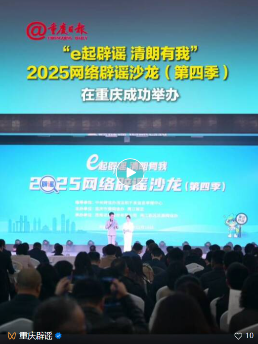 活动现场发布了《2025重庆网络辟谣年度十大案例》《重庆网络谣言治理研究报告(2025)》,以及重庆市“首批涉企网络举报辟谣工作直联点”试点单位。