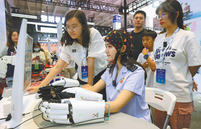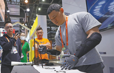 中国品牌博览会上,工作人员用脑机科技操控的假肢写毛笔字。新华社记者 方 喆摄