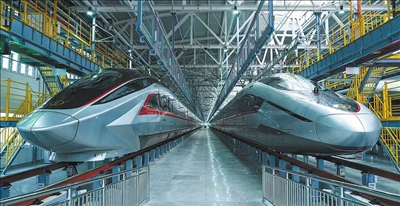 图为两列CR450动车组样车停靠在湖北宜昌动车所。唐 莹摄(人民视觉)