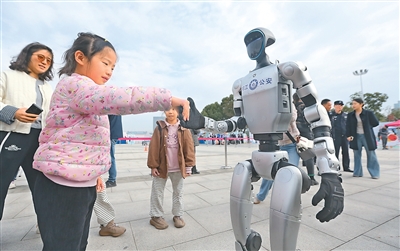 10月25日,江苏省扬州市公安局在扬州市明月湖广场举行警营开放日活动,现场设立多个主题互动展区,市民可以近距离接触警务装备。图为人形机器人与小朋友互动。孟德龙摄(人民视觉)