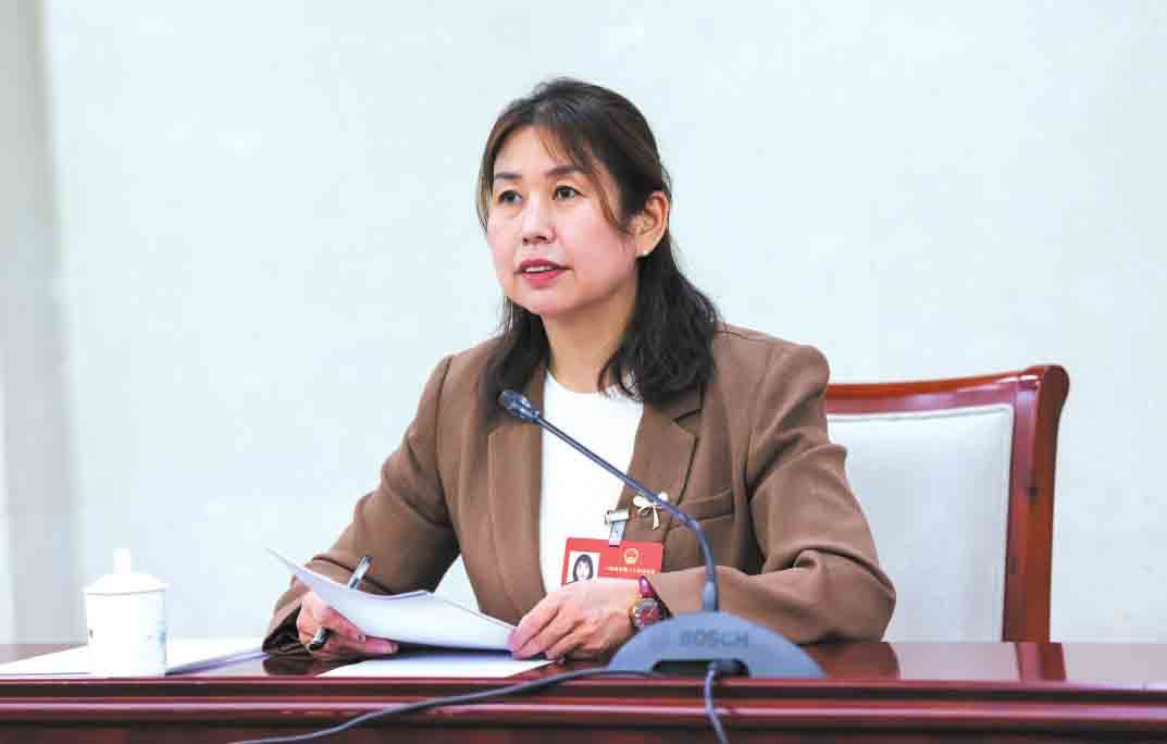 全国人大代表、山西高陶瓷业有限责任公司质量控制员范银莲正在宣讲两会精神。