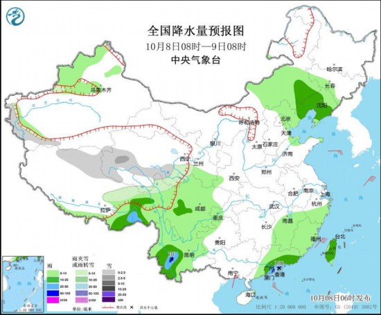 图1 全国降水量预报图(10月8日08时-9日08时)
