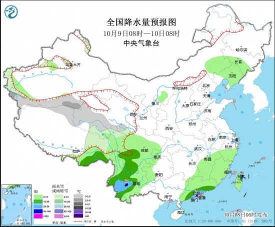 图2 全国降水量预报图(10月9日08时-10日08时)