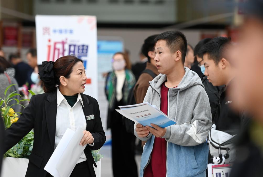 2023年11月10日,天津,求职者在招聘会现场与用人单位交流。新华社记者 赵子硕 摄