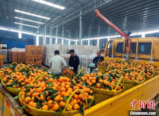 1月5日,在广西南宁市西乡塘区双定镇义平村,村民将刚采摘的砂糖橘打包装箱供应中国东北市场。中新社记者 黄艳梅 摄