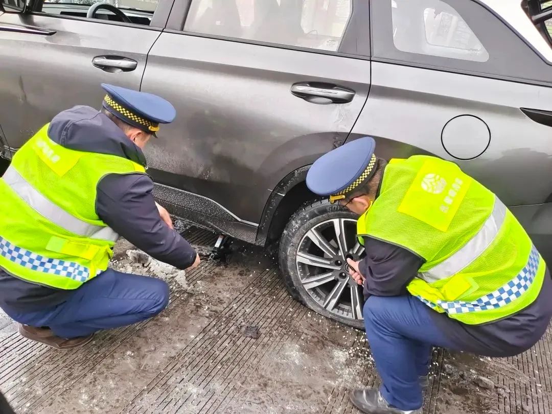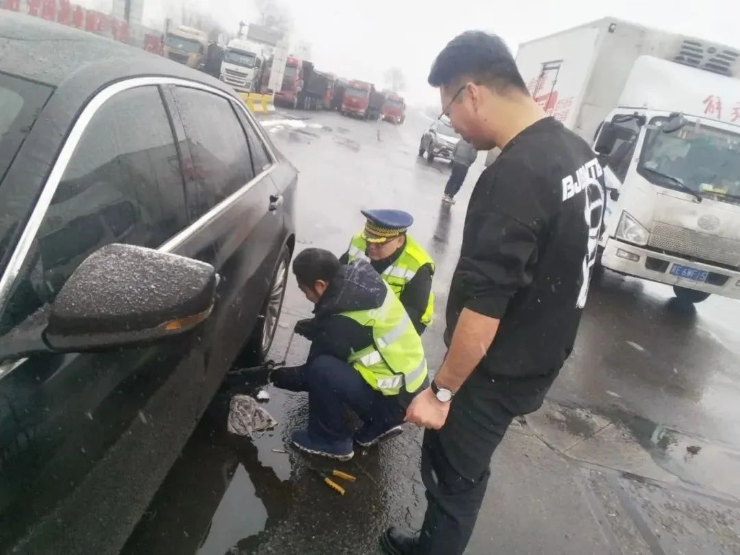 在汾阳西收费站附近,一私家车主想要拆卸下防滑链,但不会操作,热心的高速收费员从站内拿来拆卸工具,和治超员一起,帮车主拆卸下防滑链。