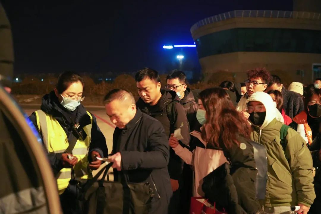 为了早点回家,旅客们披星戴月,赶最早的航班。太原机场地服人员更是早早守候在停机坪,帮旅客检票登机。