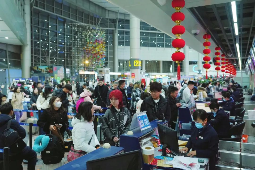 太原机场候车大厅内,人流如织,工作人员有条不紊地帮旅客办理乘机手续,保障她们准点登机、早日回家。
