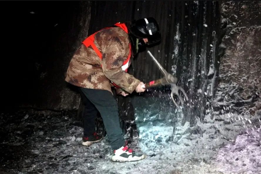 “咣当咣当……”,为了让列车安全通过隧道,大同工务段的铁路“打冰人”抡着尖镐,狠狠地砸向拱壁上的冰柱,加紧隧道内的除冰作业。