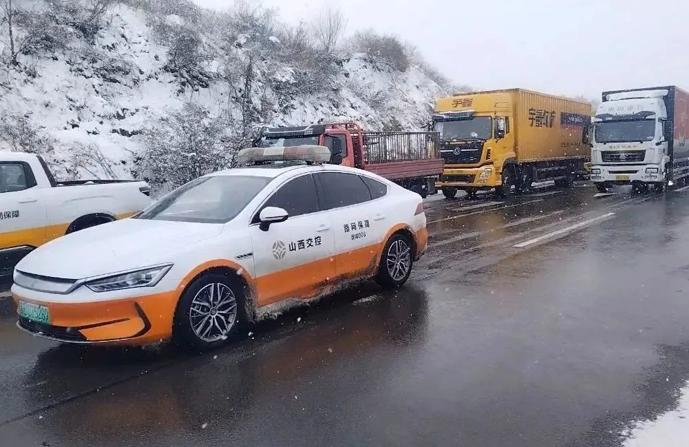 降雪过后,高速路上路面湿滑,山西高速交警和交控集团人员为乘客开道,一路护送,保障旅客平安回家。