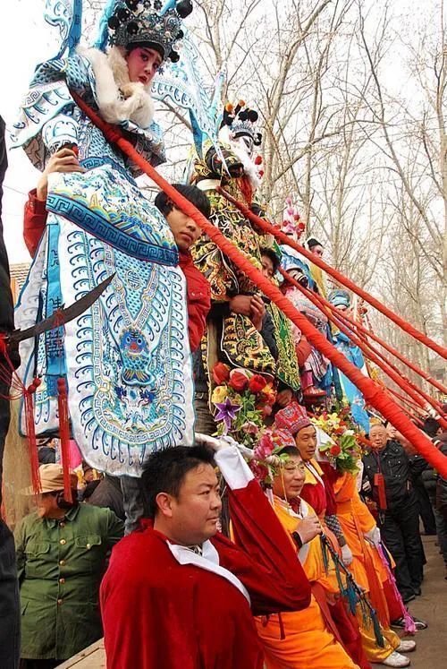 再比如运城稷山有一项特殊的民俗活动——高跷走兽。需要两名表演者一前一后配合默契,共同套上沉重的“兽”,脚踩一米多高的高跷,在锣鼓声中进行踱步、跳跃等表演。