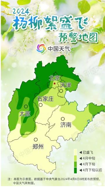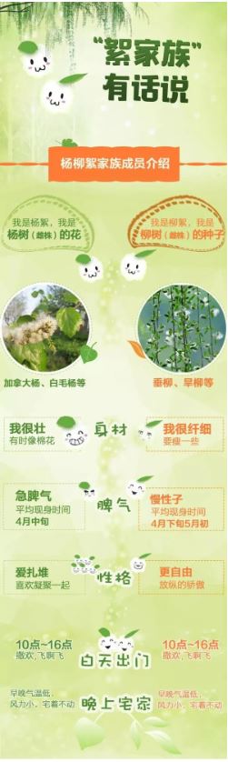 以华北地区最早开始飘絮的白毛杨为例,当日平均气温大于0℃时,白毛杨才能正常生长发育,将这些超过0℃的数值累加起来,当总和达到480℃,且日平均气温达到14℃,杨絮就开始飘飞。华北一带,往往4月上旬前后达到这一标准。杨絮飘飞10余天后,柳絮也会进入飘飞期。