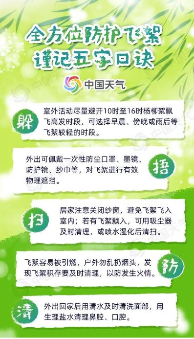 随风飘散的飞絮可能会携带花粉、粉尘等物质入侵人体呼吸道,引发皮肤或呼吸系统的过敏症状,且杨柳絮属于易燃物,遇到明火会迅速燃烧蔓延,甚至引燃其他可燃物,酿成火灾。记住五字口诀,全方位防护扰人的“四月雪”。