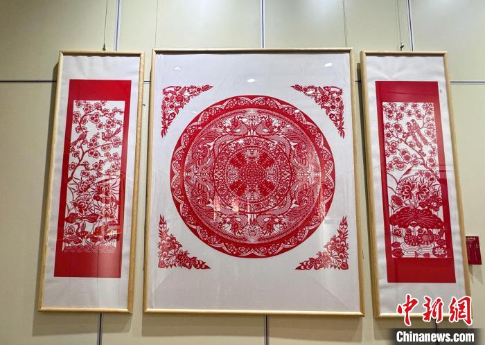 现场展出的盘合作品和《婚俗服饰》系列剪纸作品。杨静摄