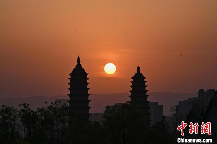 4月17日,山西省太原市,夕阳与百年古刹永祚寺双塔相互映衬,现“双塔落日”景观。 中新社记者 韦亮 摄