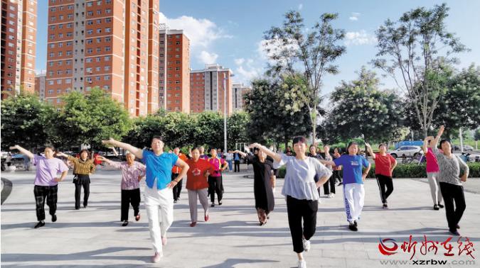 8月10日早上,民心家园小区居民在比邻的遗山公园内跳舞、走旗袍秀,展示精神风貌,享受幸福生活。 曹建华 摄