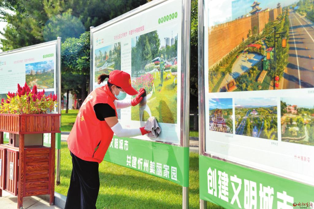 9月9日,市园林服务中心的志愿者正在忻州城区体育广场清洁宣传栏。眼下正处于创建全国文明城市的攻坚阶段,忻州市各单位的志愿者纷纷走上街头、广场、小区,为创文助力。 张存良 摄