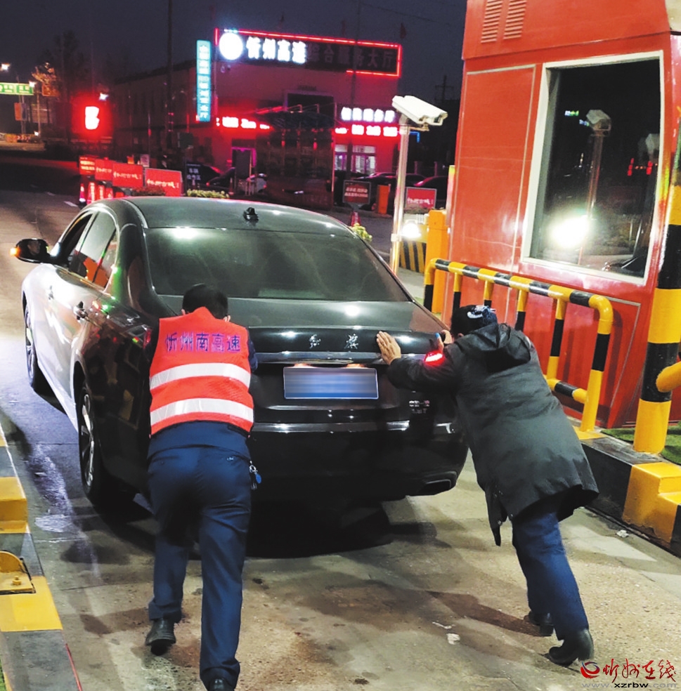 1月3日,南高速忻州收费站出口驶入一辆黑色红旗小客车,在起步离开时车辆突发故障无法正常驶出车道。值班班长得知后在安慰司乘人员情绪的同时,立即组织工作人员一起将车推出收费车道停放至安全区域,并摆放好隔离墩,防止事故发生,同时积极为司机联系附近修理厂,安排维修人员前来维修。( 李瑞军 庄新华 摄影报道)