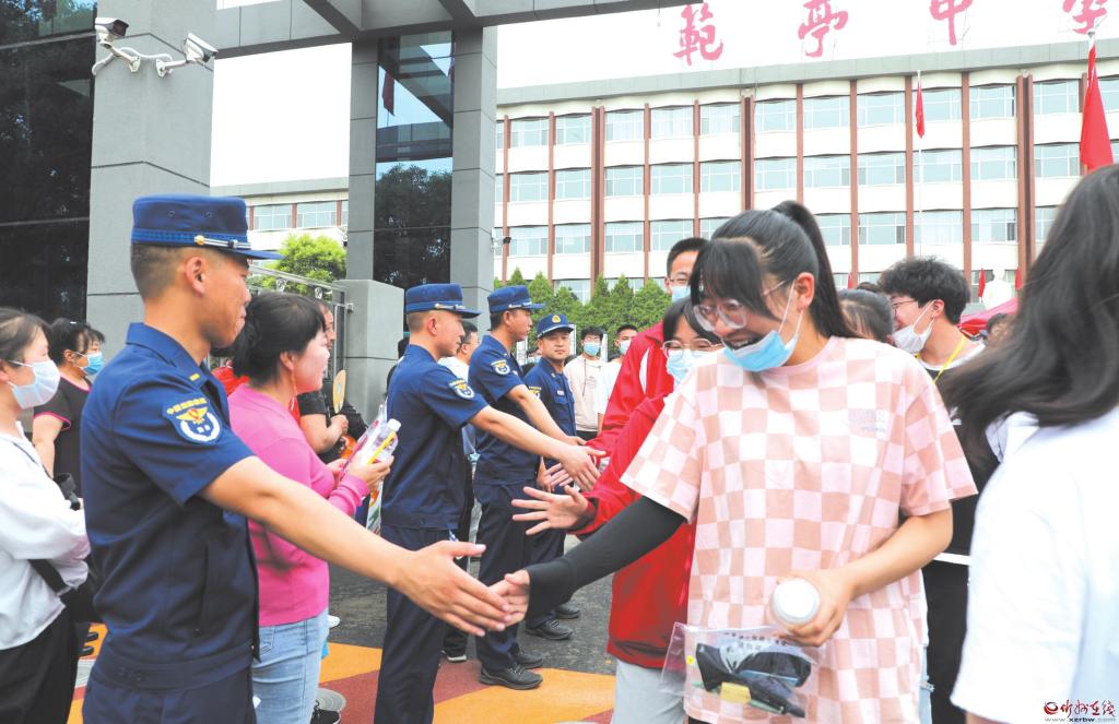 6月7日,全国高考开考,原平市2670名考生走进考场,经历人生中的一次大考。考生在考场上认真答卷,社会各界营造良好的考试环境,为考生保驾护航。图为在原平市范亭中学考点,考生完成首场考试后走出考场,消防救援工作人员与他们击掌,为他们鼓劲加油。(褚 震 摄)