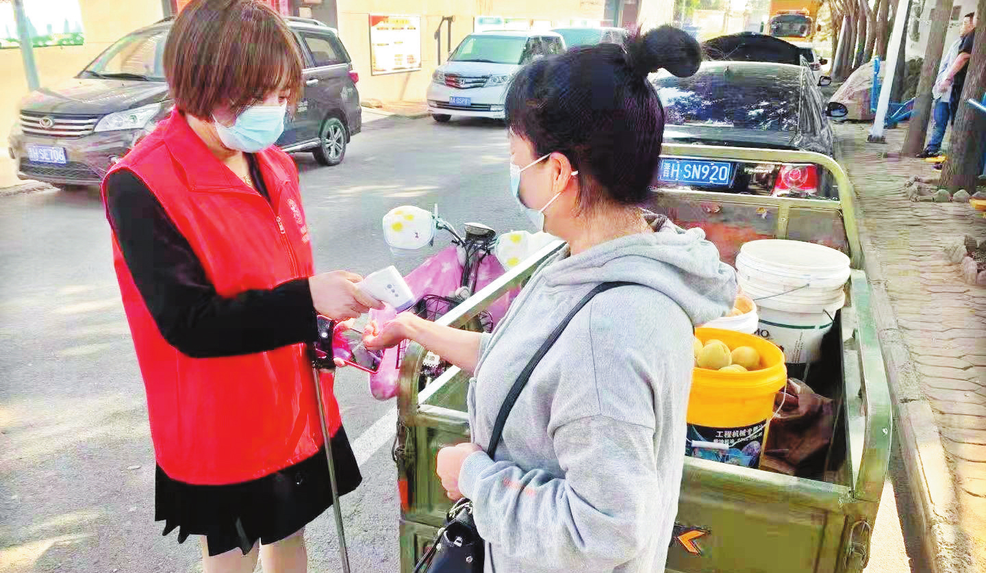 忻府区南街村新时代文明实践站的志愿者在桥西街巷为居民测体温。 许宁宁 摄