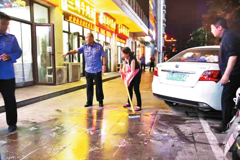 据了解,此次行动共出动执法人员近30名。通过专项整治,进一步规范了城区商铺的经营秩序,提升了居民的环保意识和文明意识,营造了和谐文明的市容环境。图为执法人员与商家一同清理店铺门前油污。(记者张志远 摄影报道)
