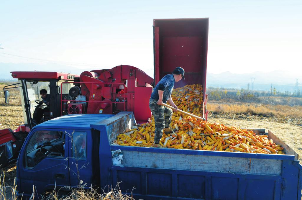 五台县东冶镇北一村积极推进土地确权流转,使外出村民弃耕和管理不善的土地向种田能手集中。村民王春明流转土地800亩,并购置了大型农机具,进行科学种植,实现了增收致富。图为王春明利用收割机抢收玉米,保证颗粒归仓。 (王金龙 摄)