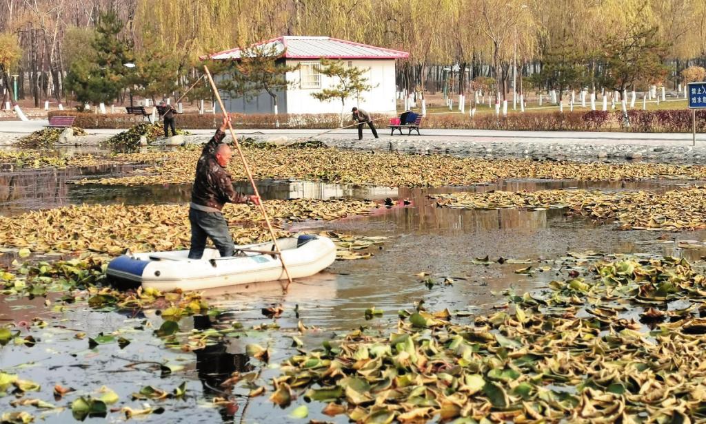 近日,五台县园林工人在湿地公园打捞水面上的垃圾和落叶。入冬以来,天气渐冷,叶落花谢,五台县适时启动水面清洁工作,打造净水环境。(