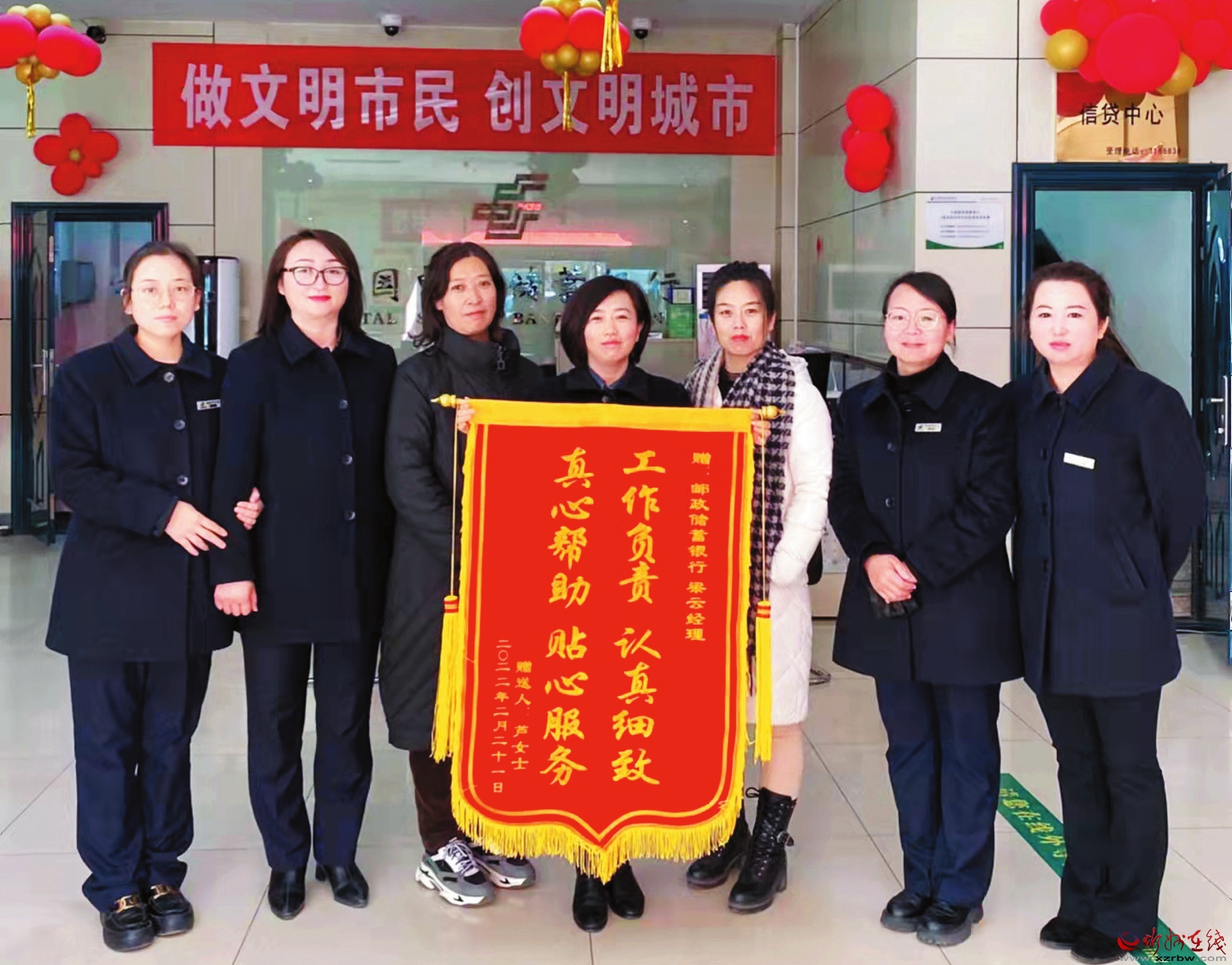 2月21日,市民芦女士将一面印有“工作负责 认真细致 真心帮助 贴心服务”的锦旗送到邮储银行忻州市分行人民公园支行,由衷感谢理财经理梁云认真负责、高效便民的优质服务。 (王 杰 摄)