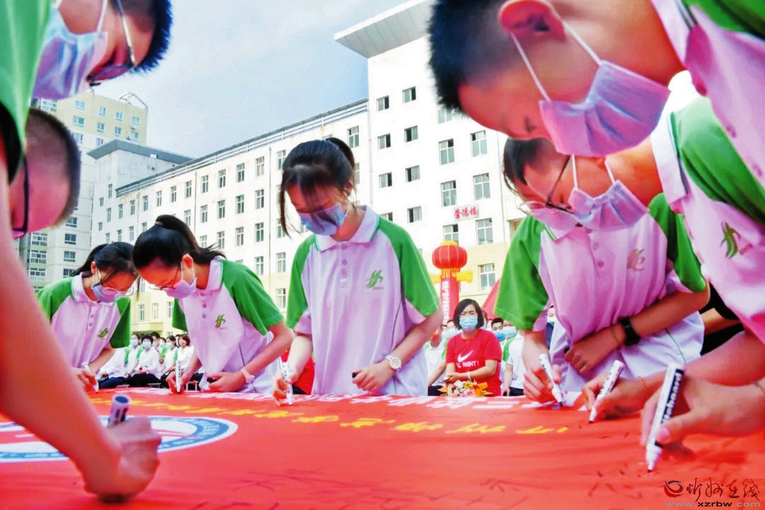 近日,忻州师范学院附属外国语中学举行2022届初三学生毕业典礼,学校领导、家长代表、初三年级老师共聚现场,为学业有成、即将离开母校、开启人生新征程的毕业生送行,并送上美好祝福。毕业生们心怀感恩,在校旗上签下自己的名字,期待新的开始。(赵晨善 摄影报道)