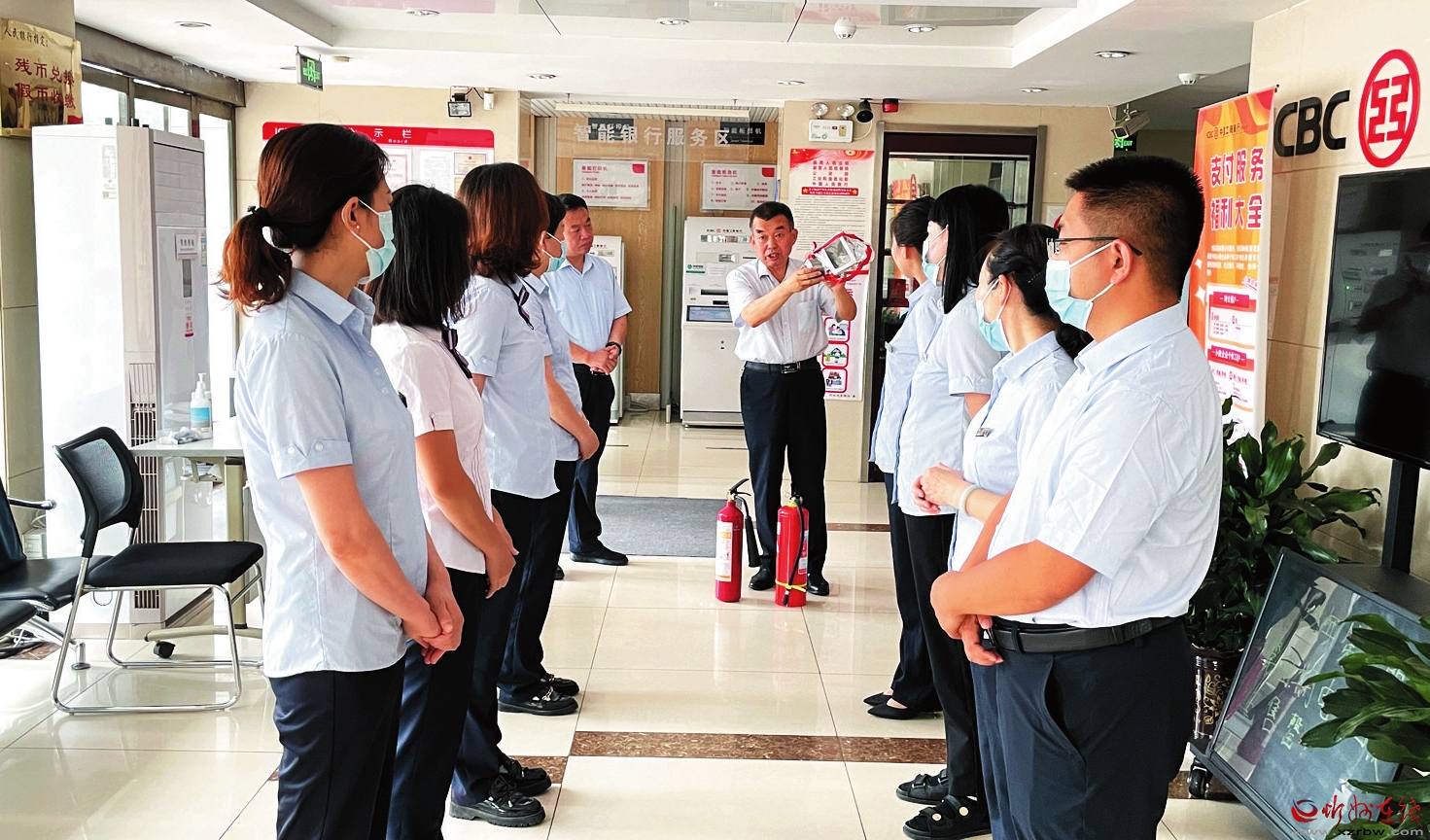 为增强员工的消防意识和避险自救能力,近日,工行忻州和平街支行举办了2022年度夏季消防安全培训。培训内容通俗易懂、操作性强,力求让大家做到“四懂四会”,即懂本岗位的火灾危险性、懂预防火灾的措施、懂灭火方法、懂逃生方法;会报警、会使用消防器材、会扑救初起火灾、会组织人员疏散逃生。图为专业人士现场演示了干粉灭火器等消防器材的使用方法,讲解了火灾事故的处理方法等。(班如喜 摄)