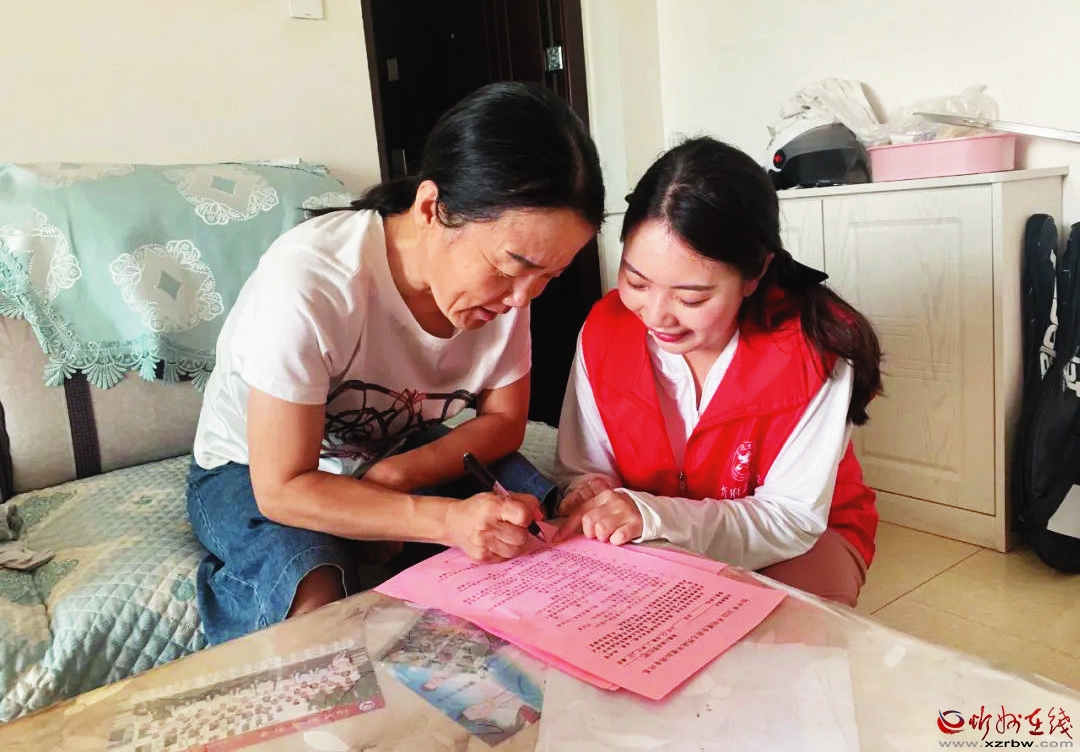 志愿者在居民家中指导居民填写调查问卷。刘慧 摄