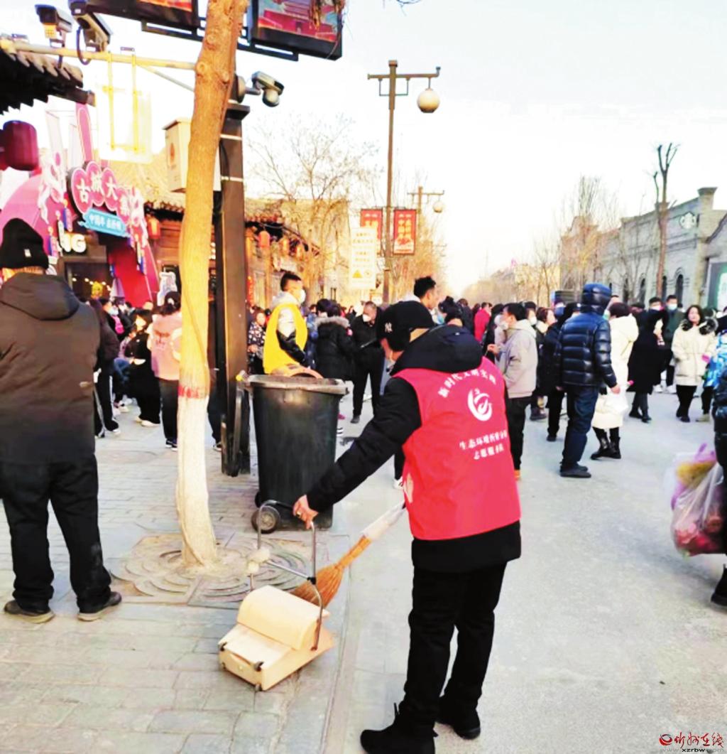 1月25日(农历正月初四),市生态环境局忻府分局组织的志愿服务者身穿红马甲,活跃在忻州古城明月楼两侧和打磨巷、周家巷等处。他们用实际行动向游客传播文明旅游理念,提供出行安全宣传,细心地向游客介绍游览路线、古城美食,并开展捡拾垃圾活动。