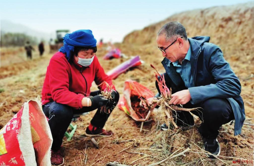 近日,五台县阳白乡桑院村北部岭坡地种植的大片芍药进入收获季。村党支部书记、村委会主任李肖峰带领村民忙着机械采挖、分级归类、拾捡装运、晾晒、销售等,田间地头一派忙碌景象。多年来,阳白乡党委政府不断调整农业产业结构,通过鼓励农民种植芍药、黄芩、黄芪等中药材,带动当地群众增收致富。上图为机械采挖场景;下图为李肖峰为村民讲解药材分级归类注意事项。(王金龙摄)