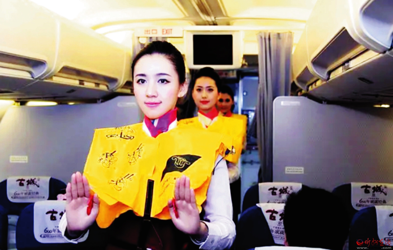 图为工作人员在飞机起飞前为旅客进行安全知识讲解。