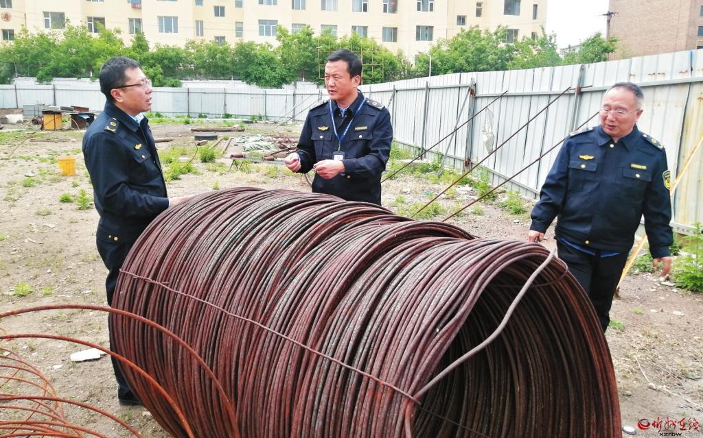 为加强产品质量安全监管,严格落实安全生产责任制,确保建筑材料质量安全,按照建筑材料产品质量安全专项整治工作方案,近日,市市场监管局对我市建筑材料生产经营单位,开展建筑材料产品质量安全专项检查。图为工作人员深入钢材市场进行检查。 (李 涛摄)
