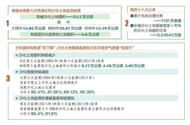 荒漠化是影响人类生存和发展的全球性重大生态问题。我省晋西北和晋北地区是全国荒漠化监测与防治的重点地区之一。经过长期积极探索,不断创新机制和科学防沙治沙,我省实现了沙化面积和程度“双下降”、沙化土地植被盖度和沙区环境空气质量“双提升”的实际成效。