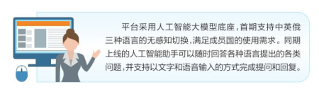 该平台采用人工智能大模型底座,首期支持中英俄三种语言的无感知切换,满足成员国的使用需求。同期上线的人工智能助手可以随时回答各种语言提出的各类问题,并支持以文字和语音输入的方式完成提问和回复。二期平台更新后,将实现产业标签、企业和产品的自动推荐功能,人工智能在用户注册后,可为用户自动生成和匹配目标企业与目标产品,优化用户体验。