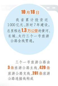 三个一号旅游公路由3条旅游公路主线、420条旅游公路支线、281条旅游公路连接线构成。全线贯通既是建设时期的结束,也意味着全线联网的开始,在三晋大地上,将唱出转型发展的黄河大合唱,奏响旅游强省的长城交响乐,书写乡村振兴的太行抒情诗。