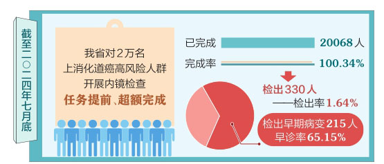 截至2024年7月底,对2万名上消化道癌高风险人群开展内镜检查任务提前、超额完成。全省2万名筛查任务,已完成20068人,完成率100.34%;检出330人,检出率1.64%;检出早期病变215人,早诊率65.15%。