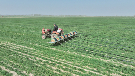 范建荣种植小麦150亩,依靠大禹渡灌区黄灌水作为浇灌来源。“麦子浇了春三水,三水对面望粮山。”范建荣说,这句晋南农谚中的“春三水”,指的是春季农田要浇灌的三轮水,其中第一轮水叫“返青水”,就是小麦返青关键期浇灌的水。