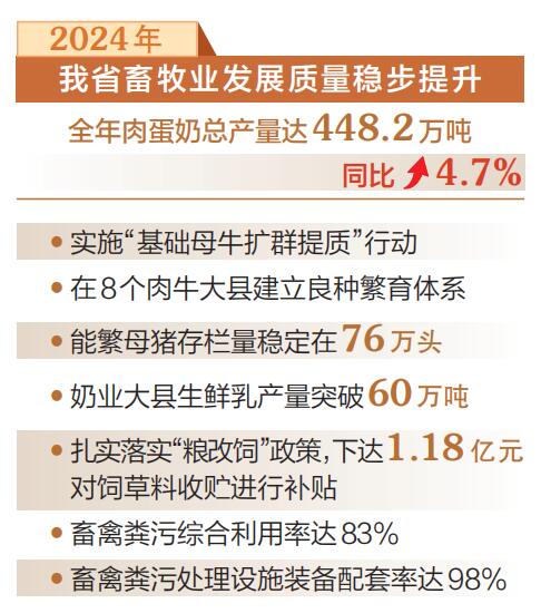 2024年,我省努力克服畜产品市场价格下行等不利因素,有力纾解产业困难,有效破解被动局面。扎实落实“粮改饲”政策,下达1.18亿元对饲草料收贮进行补贴。出台生鲜乳购销合同补贴、肉牛奶牛贷款贴息、奶企办乳制品加工补贴等8条政策,全力帮助养殖场户纾困,稳定肉牛奶牛生产。同时,优化生猪产能调控机制,生猪养殖扭亏为盈。