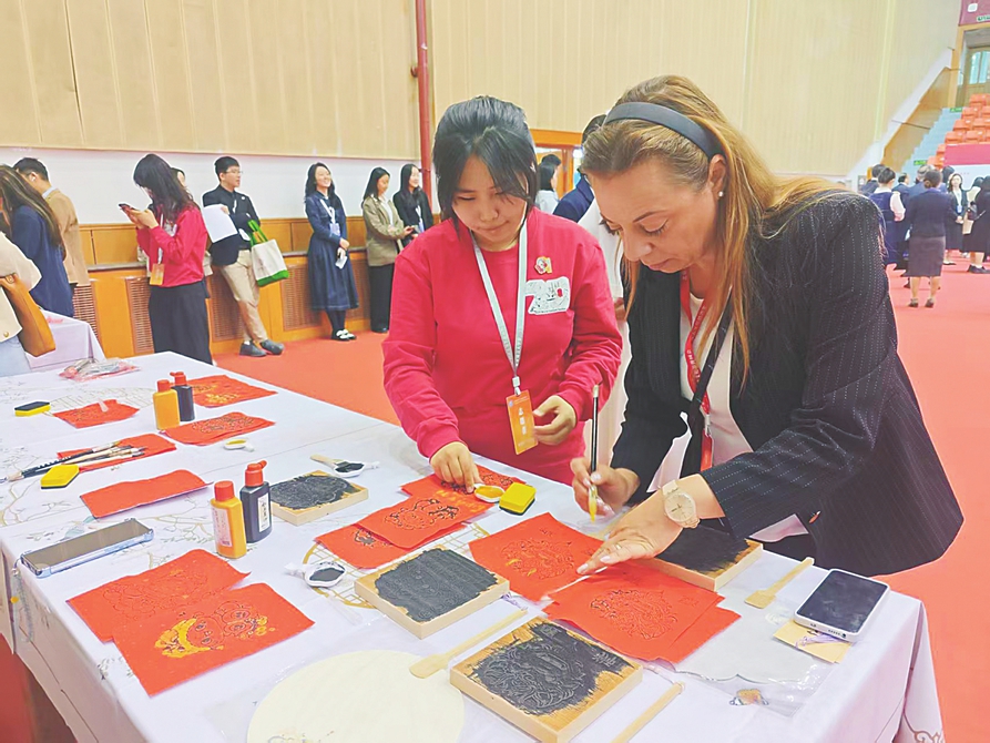 外国友人正在体验木版年画。本报记者张剑雯摄