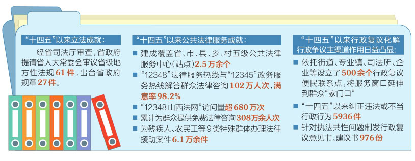“十四五”期间,我省坚持改革和法治相统一,确保重大改革于法有据。“十四五”以来,经省司法厅审查,省政府提请省人大常委会审议省级地方性法规61件,出台省政府规章27件,《山西省煤炭清洁高效利用促进条例》《山西省旅游发展促进条例》对深入推进能源革命,加快把文化旅游业培育成为支柱产业,助力资源型经济转型发展提供了制度支撑。《山西省黄河流域生态保护和高质量发展条例》将生态环境保护实践中行之有效的政策制度,通过行政立法及时上升为法律制度,用法治力量让母亲河水量丰起来、水质好起来、风光美起来。