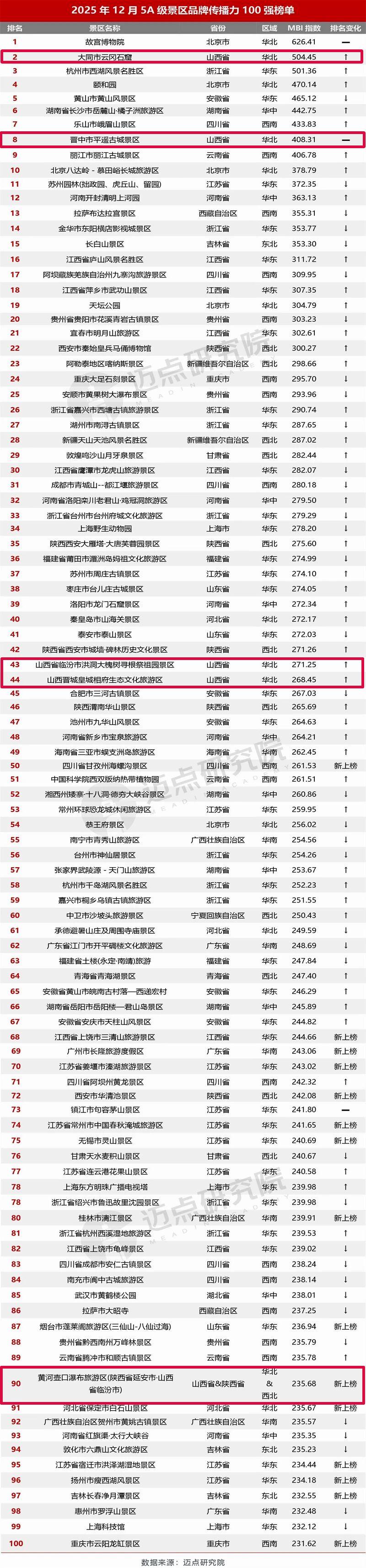 迈点研究院1月16日发布“2025年12月5A级景区品牌传播力100强榜单”,山西省5家景区榜上有名,分别是云冈石窟、平遥古城、洪洞大槐树、皇城相府、壶口瀑布景区,其中壶口瀑布景区为新上榜。