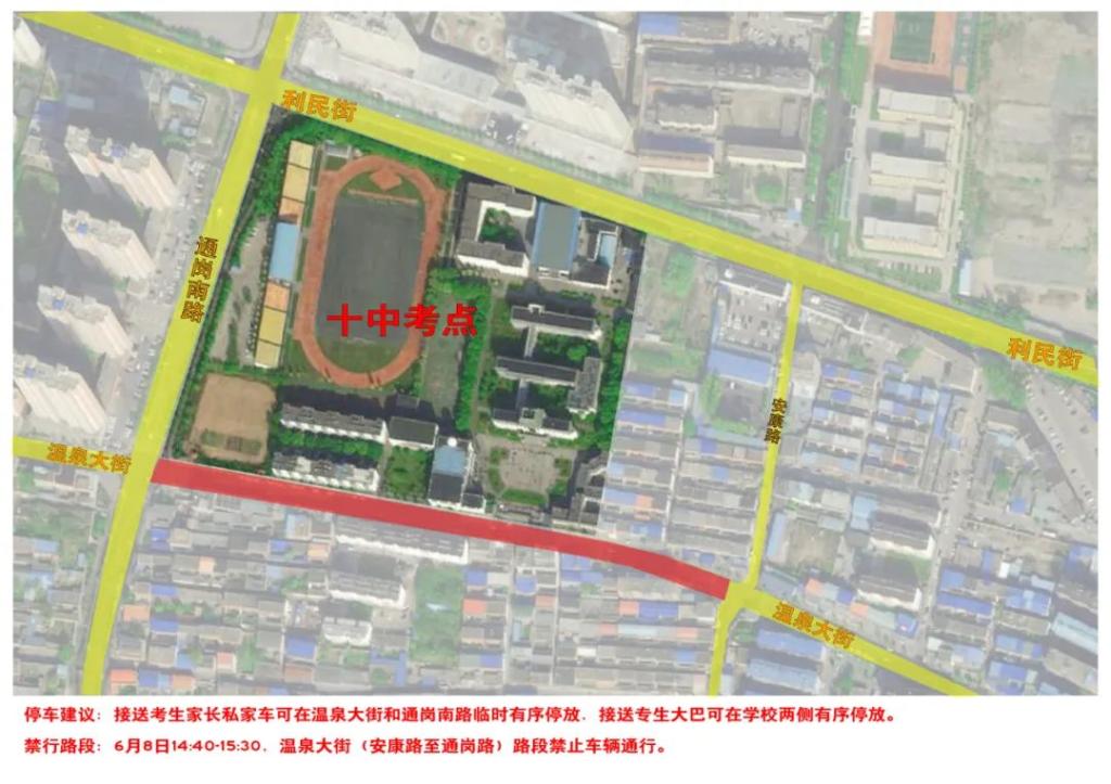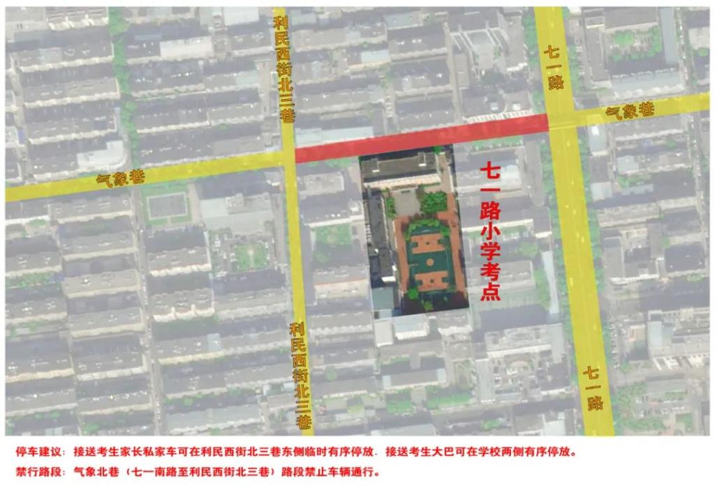 停车建议:接送考生家长私家车可在利民西街北三巷东侧临时有序停放,接送考生大巴可在学校两侧有序停放。